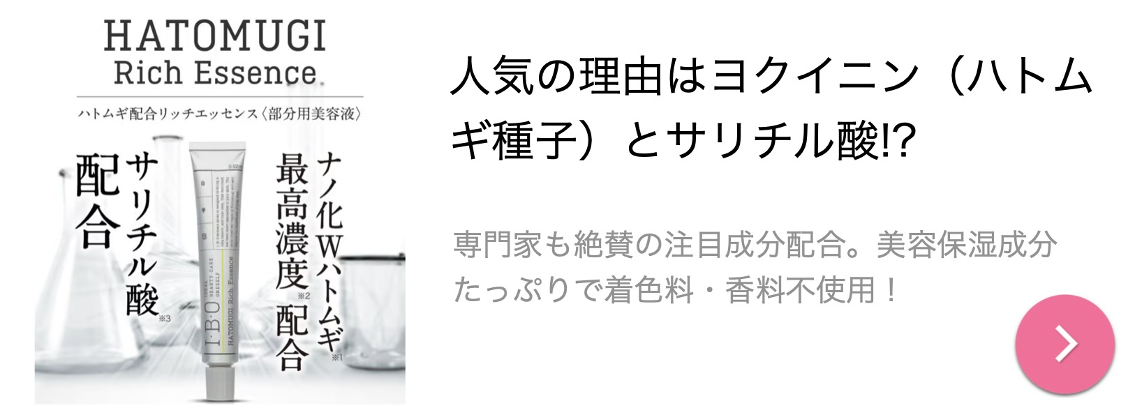 この「I.B.O HATOMUGI Rich Essence」は2つの成分がバランスよく配合されている。それだけではなく、レチノールやプラセンタエキス、ヒアルロン酸Naなどの6つの美容保湿成分も配合されているので嬉しい。